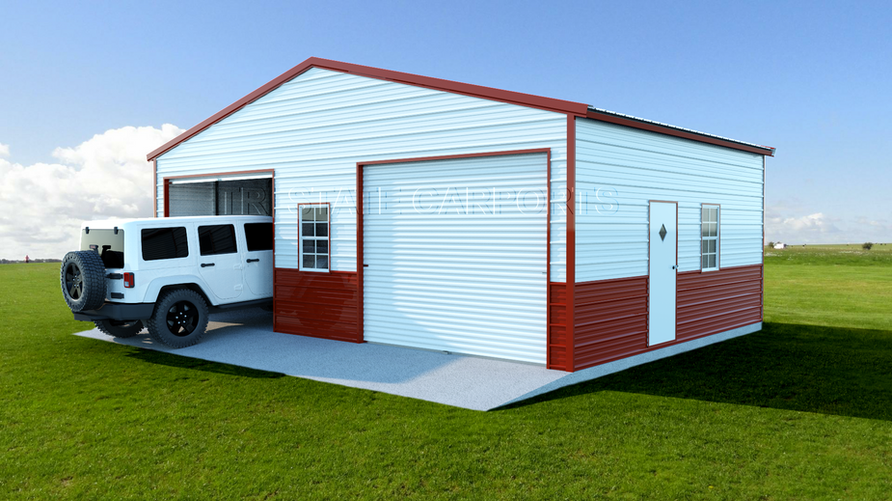 FULLY ENCLOSED, 2-10X8 DOORS ON END, 1-36"X80" WALK DOOR ON SIDE, 2-24"X36" WINDOWS